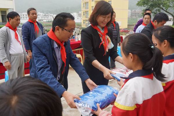 6月23日,区人大办有关负责人和熊亮来到朱昌镇小屯小学,把价值24000余元的校服亲手送到了224名学生的手上。